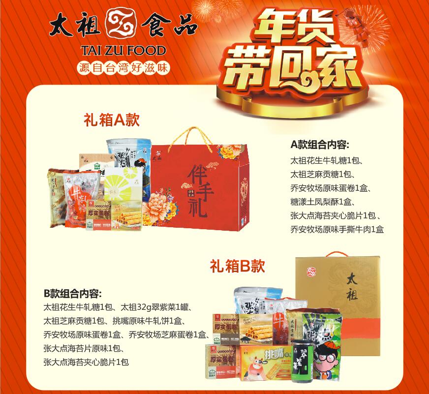 春節(jié)的腳步越來越近,又要開始準(zhǔn)備囤年貨、新春伴手禮咯。親朋好友送禮,自己家人團聚,怎么能少得了年貨禮箱呢?即日起太祖食品給您精心準(zhǔn)備了源自臺灣好滋味的大禮箱,為您的團圓時刻帶來更多的幸福好滋味。